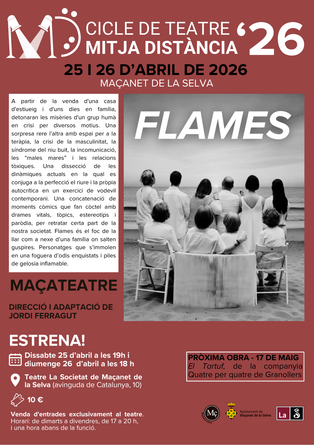 Estrena de “Flames”, la nova obra de Maçateatre (Mitja Distància) 25-04-2026 Maçanet de la Selva · https://www.xn--maanetdelaselva-fmb.cat/estrena-de-flames-la-nova-obra-de-macateatre-mitja-distancia#&gid=1&pid=1 Els dies 25 i 26 tindràs l’oportunitat de veure l’espectacle. Comparteix-hoFacebookPinterestTwitterLinkedin