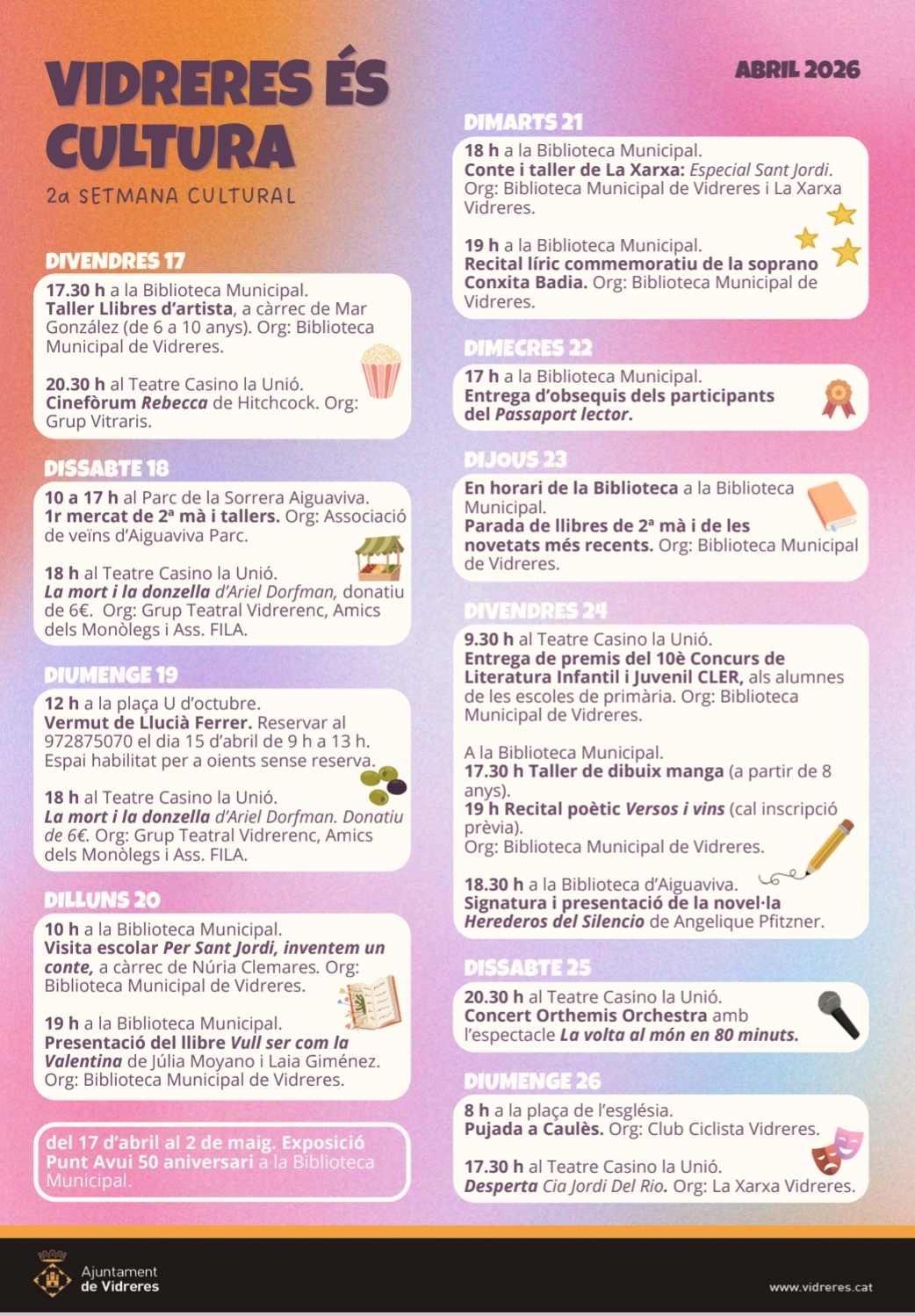 17-04-2026La programació s’estendrà del 17 al 26 d’abril, amb propostes que combinen literatura, teatre, música, cinema, tallers i activitats populars.
