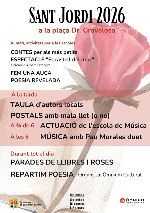 Sant Jordi a Sant Hilari Sacalm 23-04-2026 Sant hilari Sacalm · https://www.facebook.com/photo/?fbid=1866403694185510&set=a.1096535987838955 Tot a punt per celebrar una gran diada de Sant Jordi! Durant tot el dijous 23 d’abril hi haurà activitats a la plaça Gravalosa Si voleu participar a la taula de firmes autors/es locals, contacteu amb la Biblioteca Soledat Ridaura i Feixas Comparteix-hoFacebookPinterestTwitterLinkedin