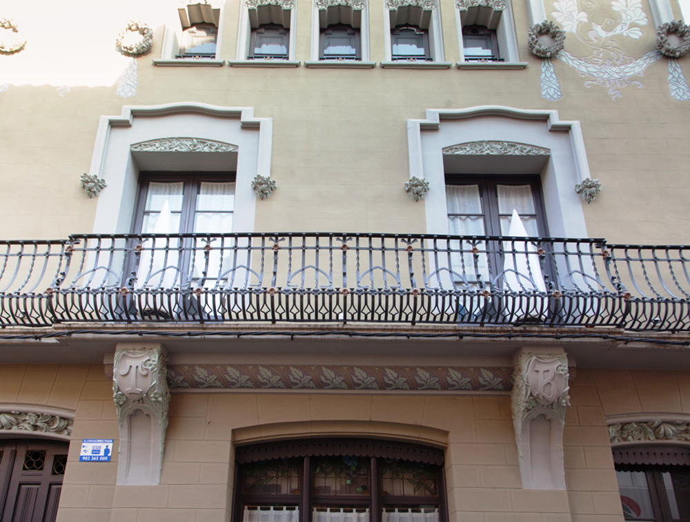 – Can Muixac (c/ Major, 19). El elemento modernista más interesante de esta vivienda es el gran ventanal de la planta noble, con dintel decorado con relieves, un guardapolvo muy trabajado y una barandilla abombada de hierro forjado. Particular.